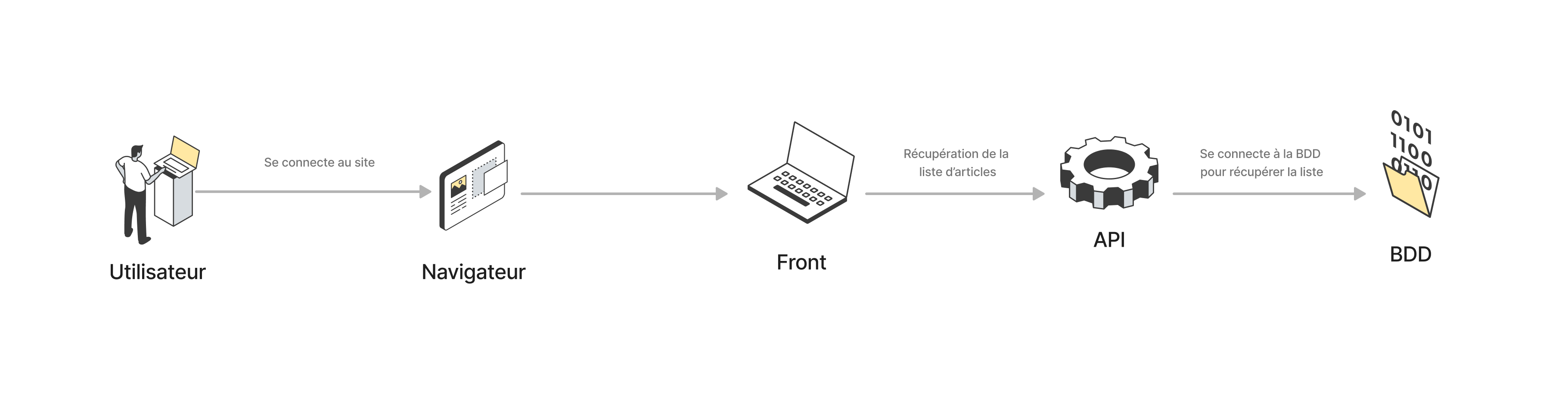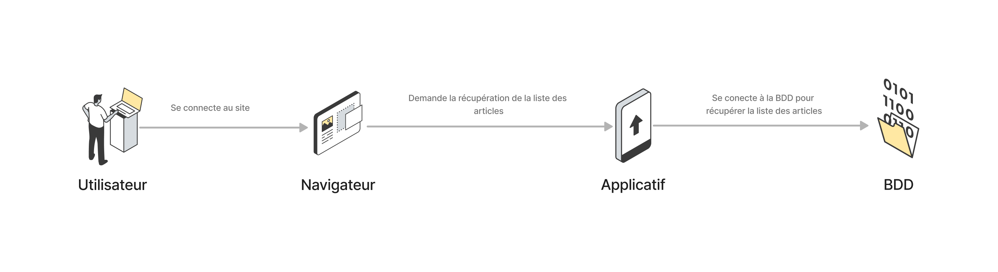 Côté utilisateur, l’internaute va se connecter à un site, par exemple une boutique en ligne, son navigateur va interroger l’API pour récupérer la liste d’articles, l’API vient donc afficher ce qu’elle trouve dans sa BDD.