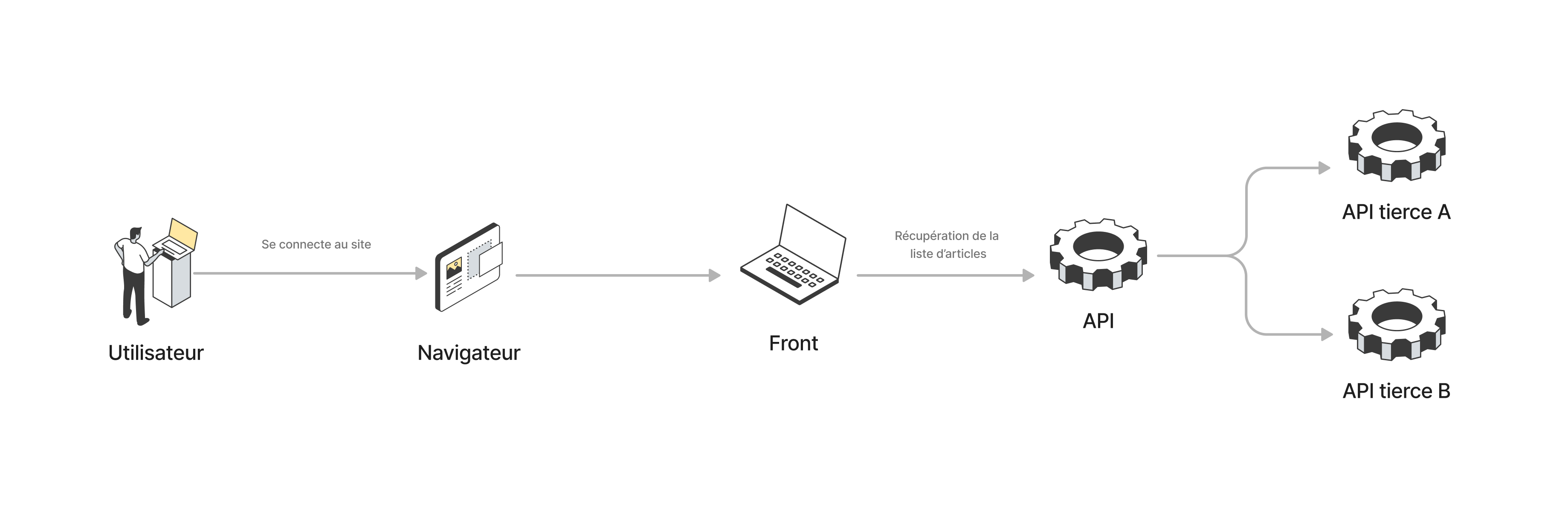 Dans certains cas où nous ne serions pas maître de la données dont nous avons besoin, nous pouvons concevoir une API qui vient elle demander la récupération de la liste d’articles à des API tierces qui suivraient elles un cheminement classique développé plus haut.